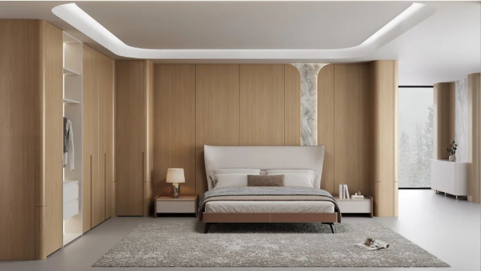 卧室的墙面由橡木进行装饰,为空间增添温暖和自然感。柔软的双人床、灰色的床单与白色的枕头,营造出整洁大方的氛围。简约设计的床头柜和衣柜,让整个卧室显得宁静而清新,为居住者提供舒适的休息空间。