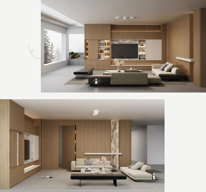 在客厅中,采用L型空间组合设计形式,将护墙、木门、电视柜统一整合,打造整体协调的视觉效果。电视柜采用悬空设计,搭配格栅背板,增强空间的延伸感;体块拼接与夹吊设计则赋予空间丰富的层次与趣味性。护墙设计融合穿插、圆弧、凹凸等多种手法,让空间更加灵动。