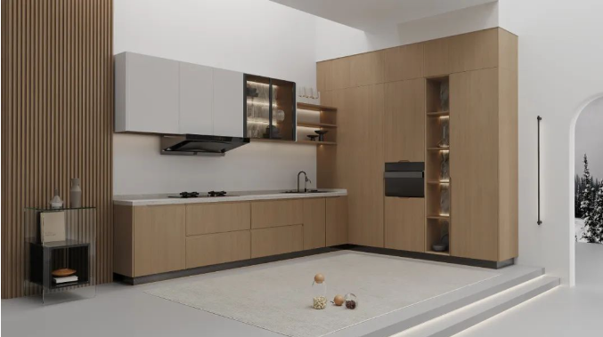 L型橱柜设计结合了封闭区与开放区,通过吊柜、地柜和高柜的多样化组合,既满足了储物需求,又增添了空间层次感。开放柜采用45°斜拼组合与斜切层板设计,造型别致,极具美感。上下分段的设计中,悬空地柜选用原木色,吊柜则采用奶白色,搭配玻璃门,层次分明,简约而不单调。在功能分区上,操作动线为三角形布局,可以高效地完成厨房工作。