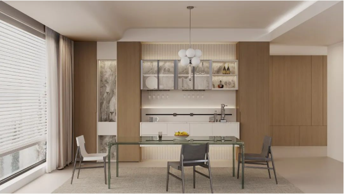 餐厅延续了极简风格,以简约的餐桌和现代餐椅为特色,白色和原木色的定制柜创造了一个纯净的用餐环境。餐边柜的上方可能摆放着一些精致的餐具或装饰品,为整个用餐区域增添了几分艺术气息。而下方的储物空间则巧妙地隐藏了各种厨房小物或备用餐具,使得整个餐厅看起来更加整洁有序。
