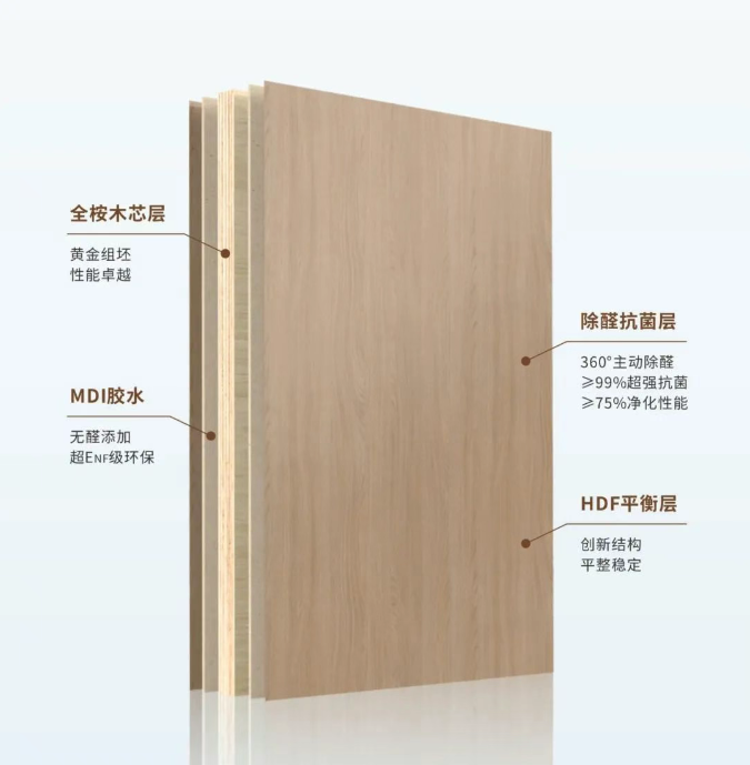 拥有超强内核,抗变形能力一流,宛如钢铁卫士守护家居稳固;双重净醛技能满点,主动净化空气;抗菌防霉本领高强,无惧潮湿,持久守护健康;表里如一颜值出众,自然纹理适配多样风格,定制家居的理想拍档。