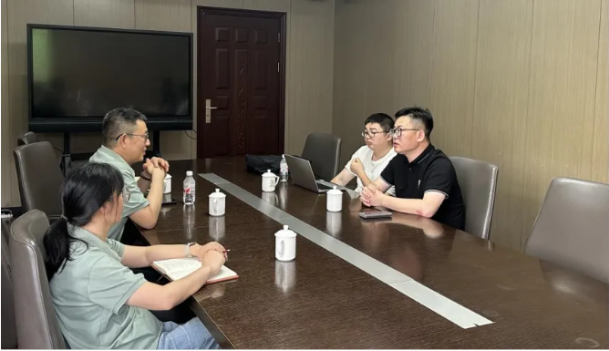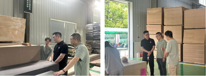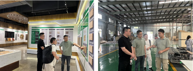 4月23日,中建三局华东装饰园林事业部供应链负责人欧传超先生及事业部供应链业务经理余昊先生莅临我司进行考察交流。在工装运营公司副总经理贾焕亮带领下,首先,参观了研究院展厅,科技木、装饰板、家具板生产车间。随后,双方举行了座谈交流,就绿色建材创新、工程渠道集采合作等议题进行了深入的讨论。
