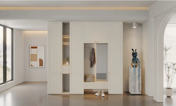顺芯板的原料是木质大片刨花,施胶后定向铺装,再热压成多层结构板材,表层刨花还会沿特定方向排列。它集合了健康环保、性能稳定、握钉力强等优点,承重能力也很出色,用它做大型柜体超靠谱。