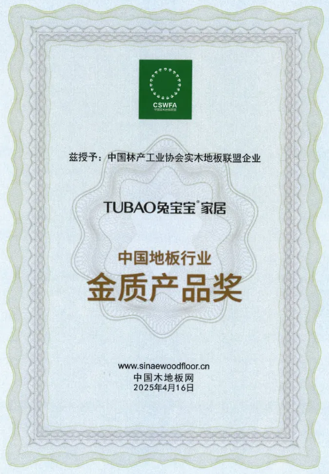 近日,中国林产工业协会实木地板联盟正式授予兔宝宝家居“中国地板行业金质产品奖”,这一权威认证不仅彰显了兔宝宝地板卓越的产品品质与行业领先地位,更体现了品牌始终践行“让家更好”的核心理念,为消费者提供健康、环保的高端家居解决方案。