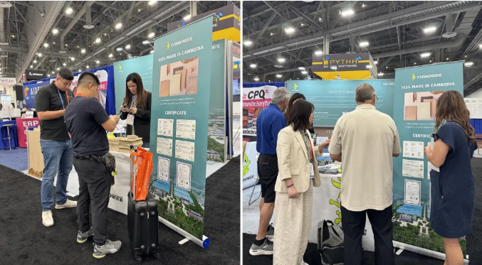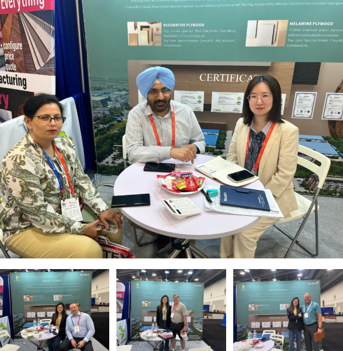 此次兔宝宝的展位设计颇具巧思。一侧是巨幅醒目的品牌海报,以鲜明的视觉冲击传递品牌理念;另一侧陈列着北美黑胡桃、直纹白橡、樱桃等高端出口产品,每一件都宛如艺术品,成功吸引众多访客驻足观赏、深入了解。多位意向客户与兔宝宝团队展开深度交流,对产品品质给予高度认可,还明确表达依托兔宝宝柬埔寨基地进行稳定采购的合作意向,为后续北美及全球市场的深化拓展奠定坚实基础。