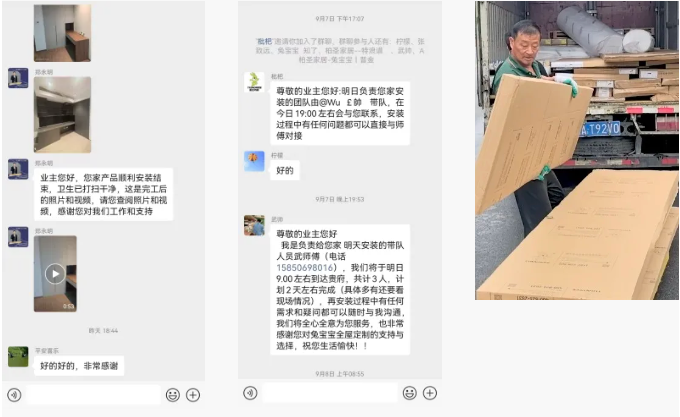南京,2025年7月—南京栖霞区业主陈先生在业主群分享了他的全屋定制经历:从下单到安装完成,无需主动询问进度。专属服务群在送货、安装、售后等关键环节都进行实时提醒和专业操作,一站式交付,省心省力。这标志着南京兔宝宝全屋定制团队在交付环节的革新。