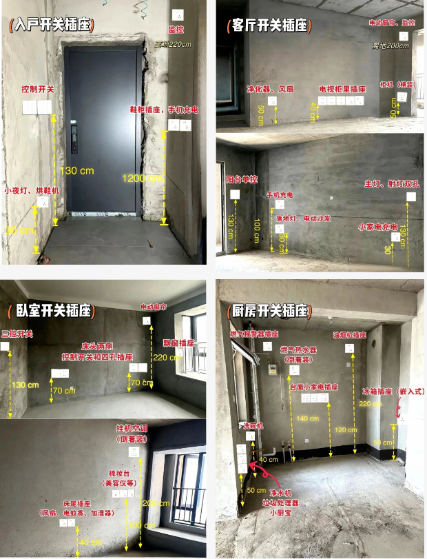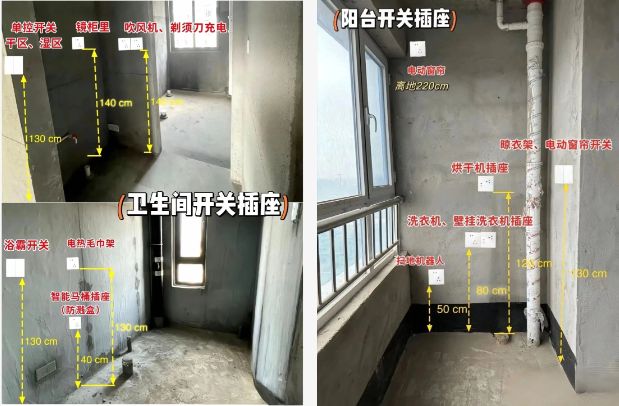 ✅玄关(监控)、马桶旁(智能马桶)、窗帘盒(电动窗帘)预留电源