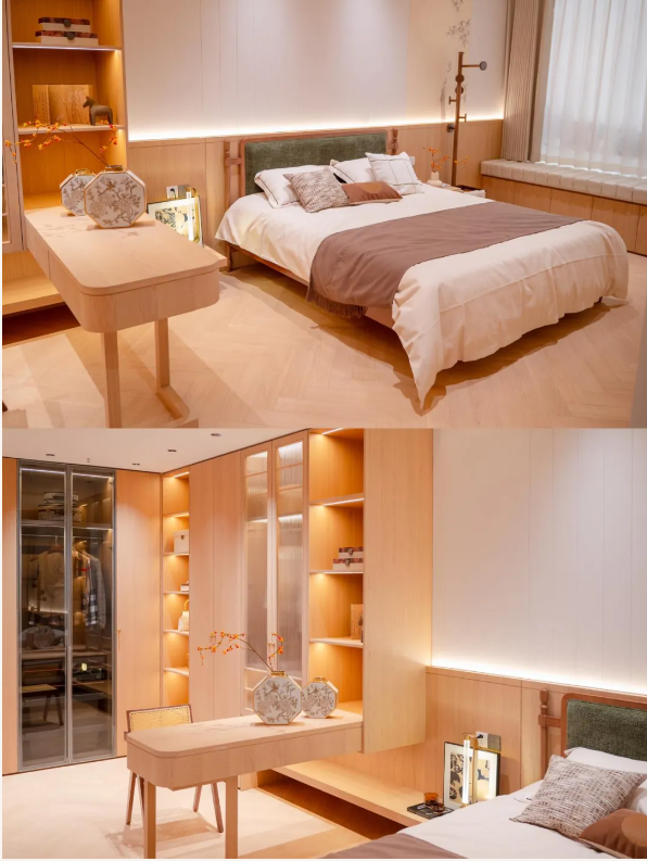 不同于传统家居店单一的板材陈列与柜类展示,兔宝宝武林之星1号店以 “生活场景”为核心,打造了1:1实景样板间矩阵。从100㎡刚需户型、130㎡改善空间,到宽敞的大平层、高端别墅场景,多维居住空间全覆盖,真实还原从毛坯到精装的全流程。小到一块板材的纹理、一个五金件的质感,大到整体空间的软装搭配、色彩协调,每一处细节都清晰可见。消费者走进样板间,就能直观触摸未来家的质感,真正实现“所见即所得”的定制体验。