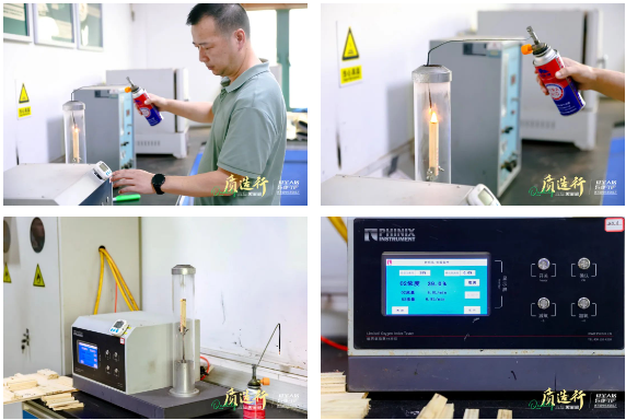 参观现场,兔宝宝安排了一场难燃板氧指数实验,是将兔宝宝难燃胶合板置于富氧环境(氧气浓度39%)下进行燃烧测试。实验结果显示兔宝宝难燃胶合板离火后快速熄灭,没有火焰蔓延,只是表面被熏黑,可见其出色的性能。通过此次直观的实验,让大家近距离感受到兔宝宝产品在阻燃性能上的优势,并感受到兔宝宝品牌的质造实力。