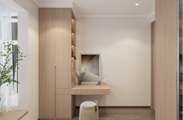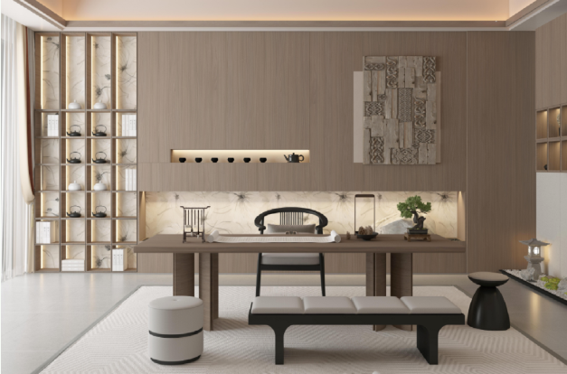 新中式风格的色彩搭配以“和谐”为主,传统的色彩有墨黑、石灰、米白等。除选择这些色彩外,采用更为柔和的“甘石 胡桃木半山纹”,亦可营造出一种素雅而禅静的氛围