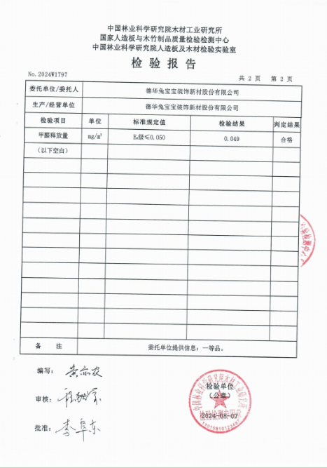 为了证实兔宝宝难燃胶合板的环保性能同样优秀最直接和真实的方式是通过公开抽样送样的方式,并对检测结果进行公示。此次检测是根据GB/T 39600-2021《甲醛释放量》标准要求,对兔宝宝难燃胶合板的甲醛释放量进行检测,其检测结果为0.049mg/m³,符合环保等级E0级。