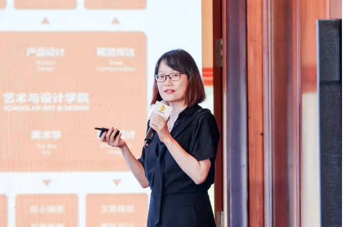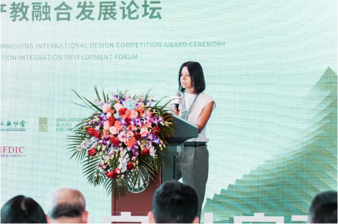 最后,南京林业大学家居与工业设计学院教授、中意家居创新设计中心项目负责人、《家具》杂志主编周橙旻以《设计无界,融合共赢》为主题进行了演讲。她通过更广阔的视角,对大赛进行回顾、对设计本身进行讲述,同时对设计的主体“设计师”做出了独到见解,她表示未来校企应该协同育人、协同创新的,这有利于推动产教融合走深走实,实现共赢发展,并共同为家居产业的高质量发展贡献力量。